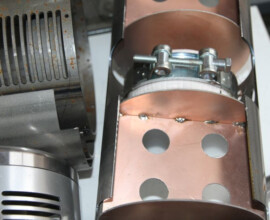 Применение тороидальных трансформаторов предопределило конструктив настоящего устройства. Усилитель состоит из обработанных лазером 3-х тонкостенных труб диаметром 140мм –для двух каналов усилителя, и диаметром 160мм – для блока питания. Трубы позволяют достаточно легко выполнить работы по шлифовке, полировке для качественной гальваники или покраски. Используя лазер, можно очень легко менять в трубах дизайн вентиляционных отверстий или менять конструктив при применении других трансформаторов и ламп. Трансформаторы, лампы органично размещены в трубах, чем достигается хорошее экранирование между блоком питания и блоками усилителей. Лампы размещены в нишах корпуса, что предохраняет от случайного прикосновения к лампам. Имеется также решение для установки защитных сеток. Порядок размещения в усилительном блоке ламп, трансформаторов позволяет организовать кратчайший путь прохождения сигнала, что есть одно из главных условий получения качественного звука. Все питающие напряжения подаются в оба канала усилителей также самым коротким путем через отверстия в боковых соединительных  манжетах. В блоке питания для организации высоковольтного напряжения применены мощные выпрямительные кенотроны 5Ц8С с последующими электронными фильтрами и двойной стабилизацией отдельно на каждую лампу. Накалы ламп также питаются постоянным стабилизированным напряжением. Для монтажа и соединений используем нормализованные серебряные   провода в тефлоновой изоляции. Большим удобством является примененная в усилителе система организации настройки режимов ламп, позволяющая производить замену ламп без привлечения специалиста.